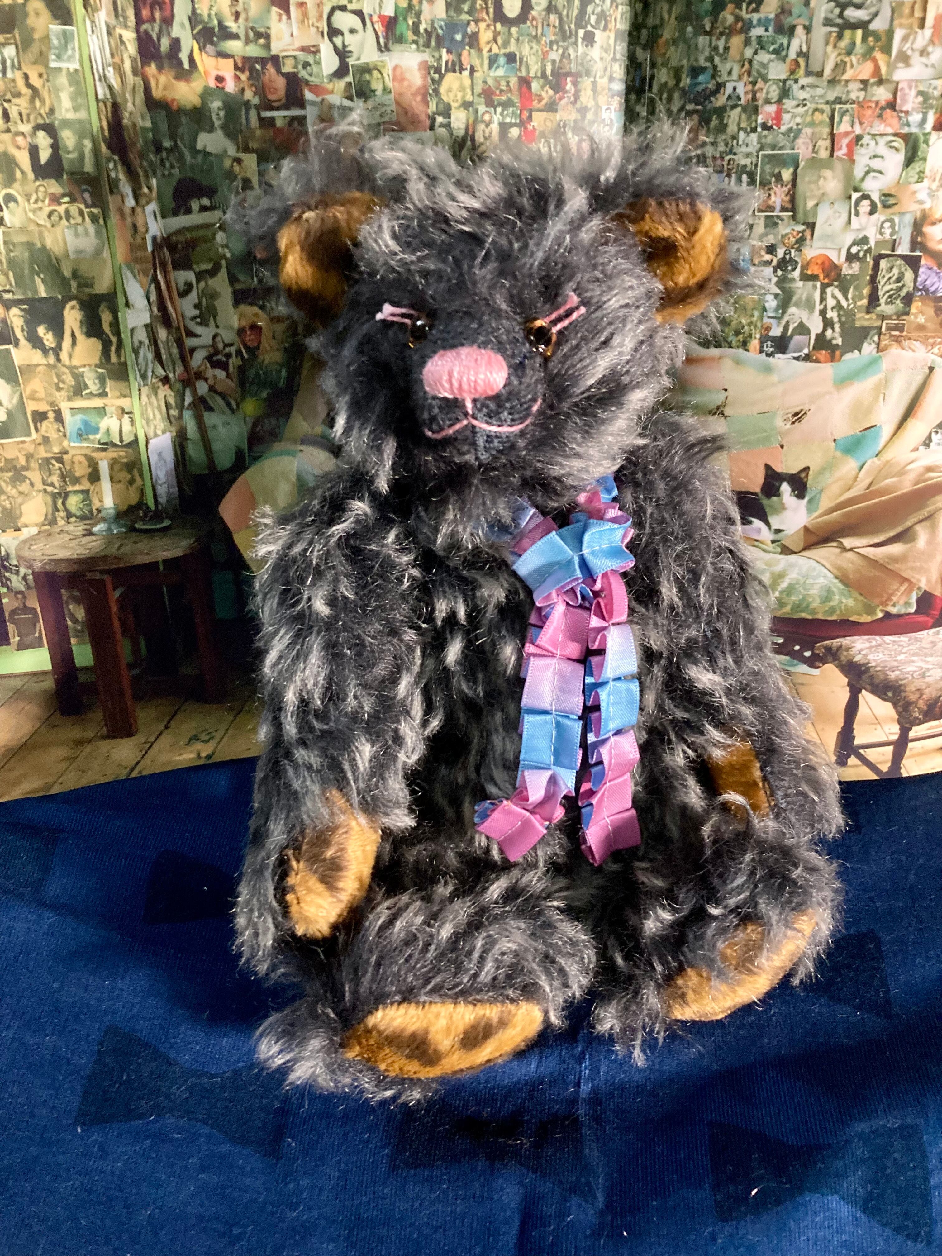 ブラックにグレーのアッシュなカーリーモヘアを使用。手足、耳はヒョウ柄になっています。